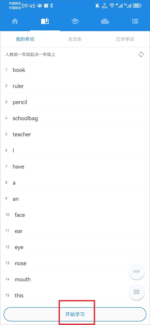 5、选择完成后,在我的单词界面中点击开始学习就可以学习到该课本中的所有单词了