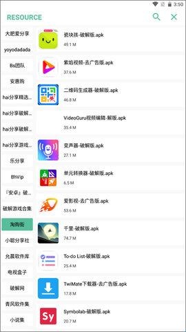 3、主要模块以资源软件为例,这里有非常多的破解版、免广告的app和游戏,通过搜索就能获取到了。