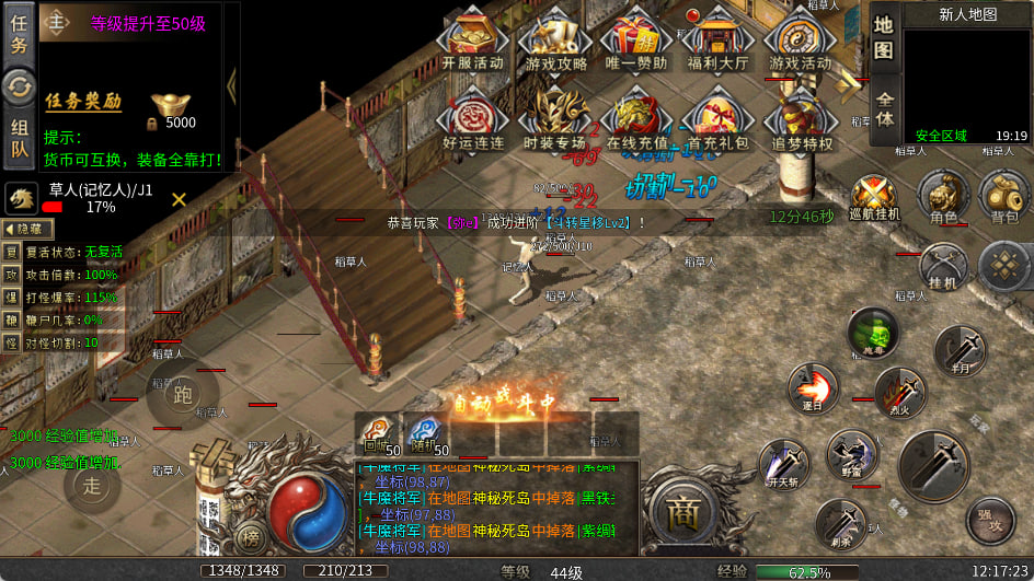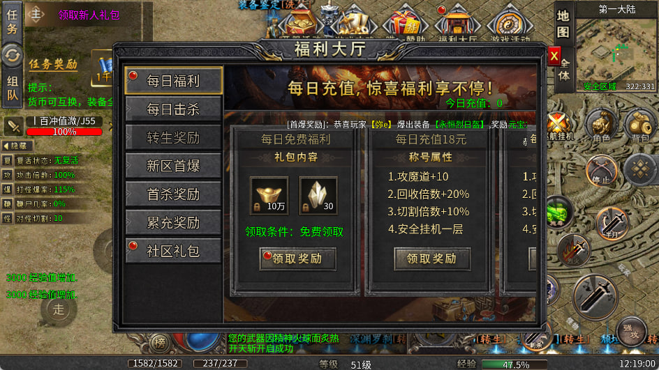 2、内置自动挂机系统解放双手,同时开启自动回收、免费爆充、打金、透视等多重福利,让散人模式也能轻松获取收益与装备资源,体验稳定成长的乐趣。