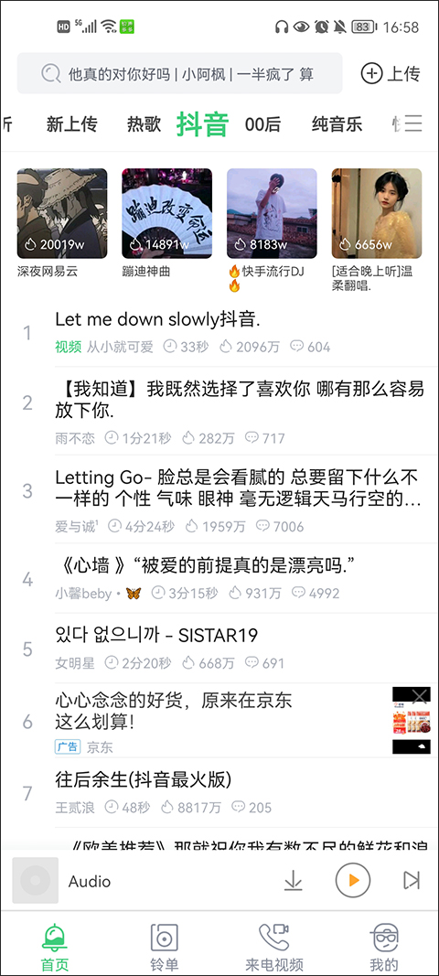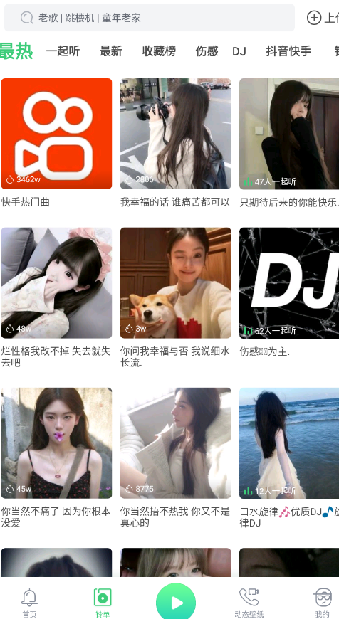 有最热、一起听、最新、收藏榜、伤感、DJ、抖音以及快手等热门音乐在这里都能发现。