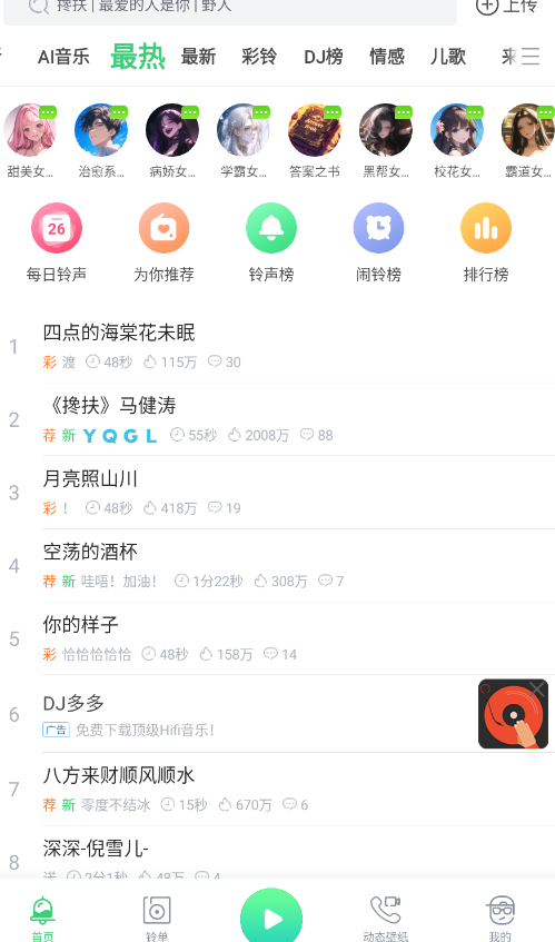 热门歌曲铃声、彩铃(炫铃),每日更新1000+。