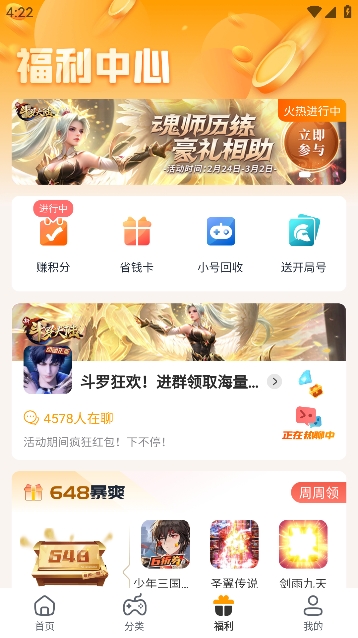 赚取游戏积分,完成平台任务领取各种不同的福利。