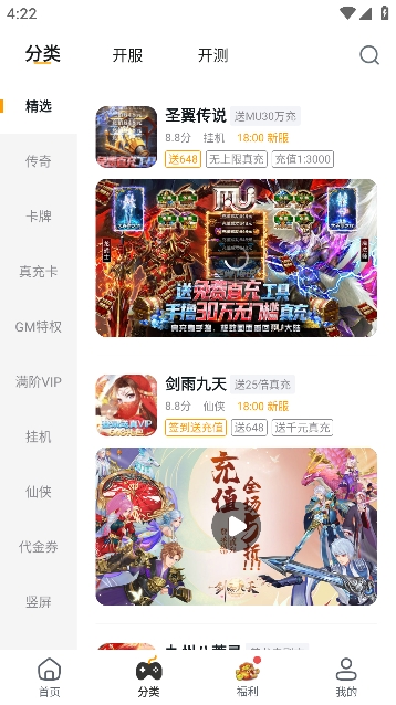 将精选、传奇、卡牌、真充卡、gm特权、仙侠等多种游戏进行分类,用户可以根据自己喜欢的类型挑选游戏进行体验。