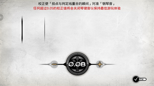 4、通过点击“-”和“+”进行校正,使拍点与判定线重合的瞬间对准钢琴音;调整完成后点击右下角的“√”;
