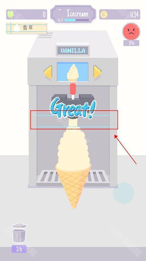 4、之后添加合适口味冰淇淋,将甜筒放入冰淇淋机,长按屏幕,等待蓝线出现时就可以停止啦,否则就会制作失败需要丢弃到左下角垃圾桶重新制作啦。