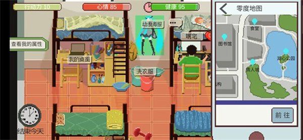 9、点击右下角的“地图”按钮,我们打开地图可以走出宿舍,前往学校其它地方,包括食堂、图书馆、健身房、培训机构、公园、情人坡等。