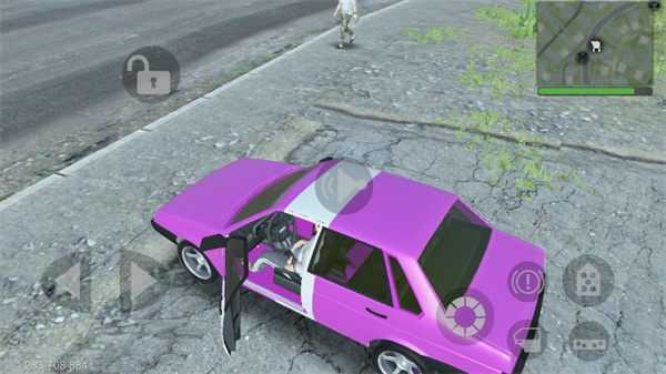 8、然后点击上方骑车按钮就可以召唤车辆,左边虚拟按键可以控制人物角色移动,右下方可以射击;