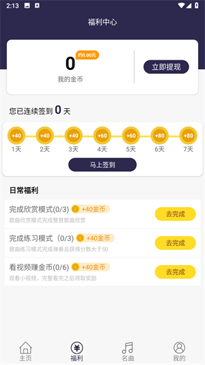 2、进入福利专区,可以签到领金币,金币可以直接进行提现。