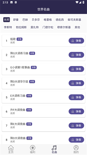 3、进入名曲专区,这里有世界名曲供你弹奏。