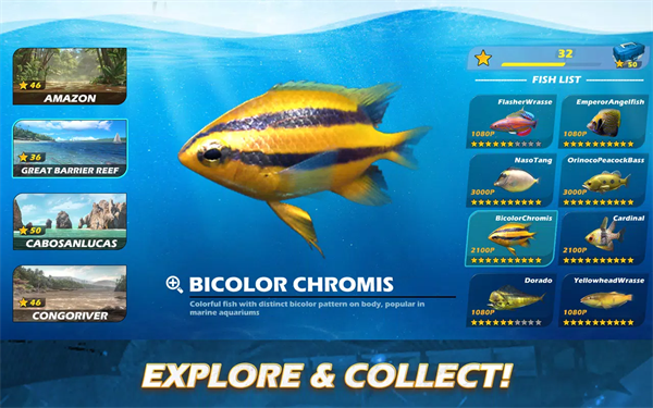 你可以挑战超过200种逼真的水下生物,从大嘴鲈鱼到帝王蟹,从小体型到稀世奇珍,都等待着被你收入鱼册,带给你超强的成就感。鱼类百科也会让你更了解各种现实鱼类。