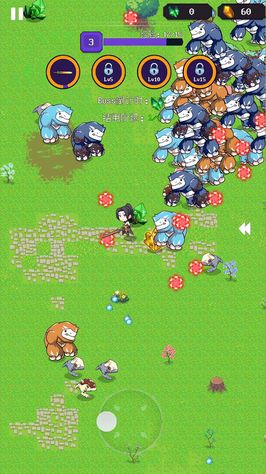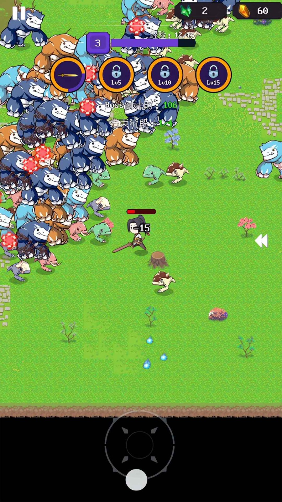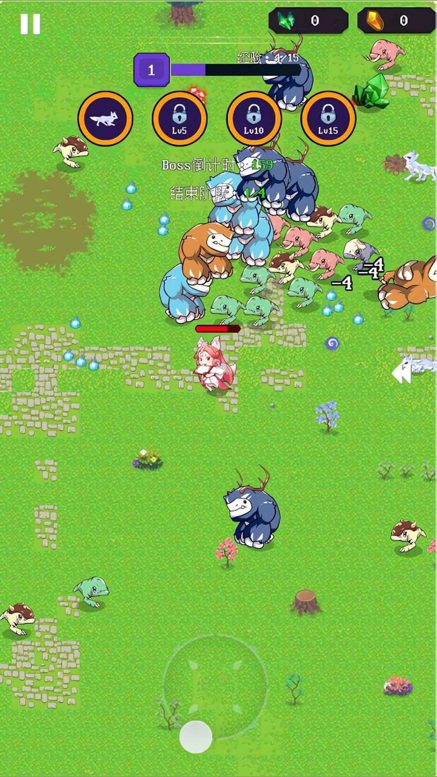 1、在游戏中,玩家需要控制角色通过走位规避怪物的攻击,并且利用自己的武器去击杀更多的怪物。怪物死亡后会掉落经验,玩家通过吸取经验可以升级,从而获取技能。关卡中有四轮,每一轮结束后都会出现一个boss,当玩家通过这四轮挑战后即可通关。