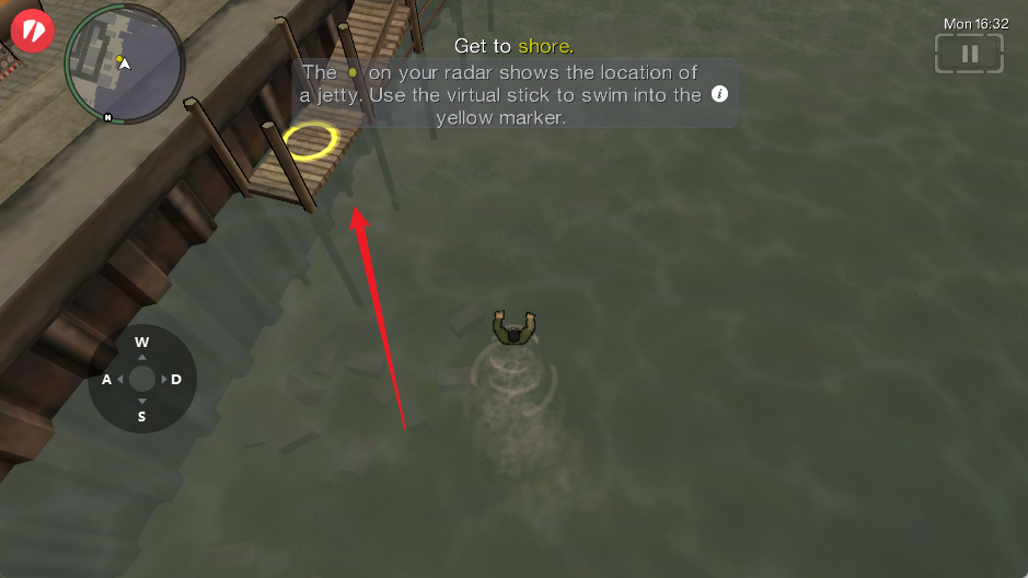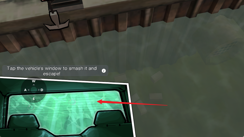 2、快速点击车窗将其击碎,根据地图指引游向岸边标记点。
