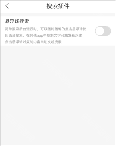 3、将悬浮球搜索功能打开,这样你就可以在简单搜索app在后台运行时,可以随时随地的点击悬浮球使用语音搜索,或是在其他app中复制文字可触发悬浮球,点击悬浮球对复制内容自动发起搜索