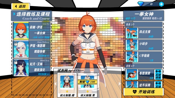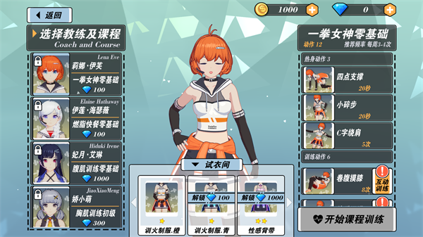2、每位教练有不同的训练计划,如莉娜伊芙就有12种训练方式,其中包含热身项目3个、训练课程6个,还有放松计划3个。