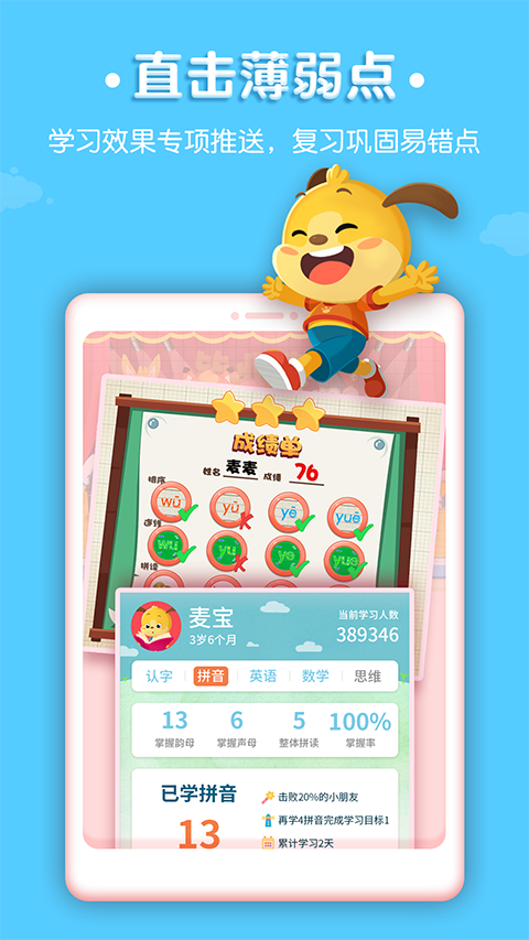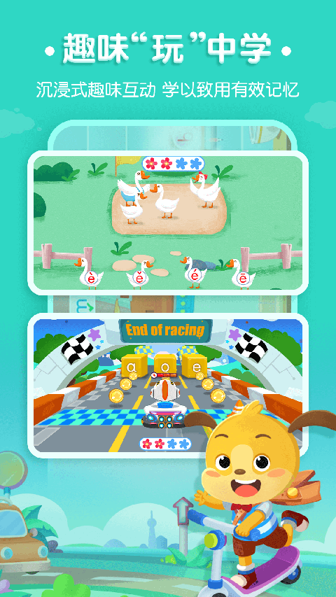 3、寓教于乐: 126个游戏形式,学习与游戏相结合,轻松打好拼音基础。