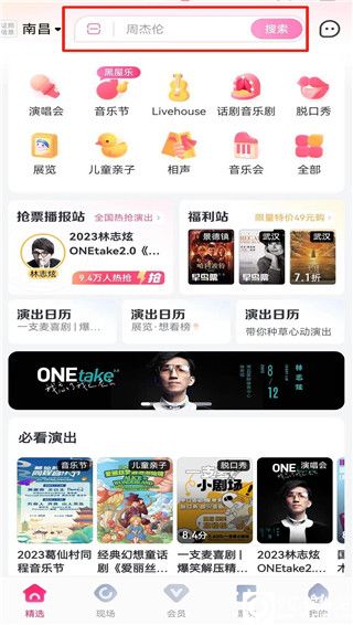 1、打开app在最上方搜索栏内搜索你想要购买的门票
