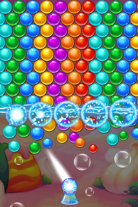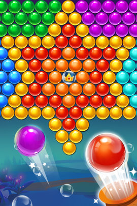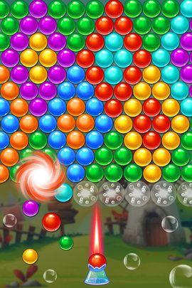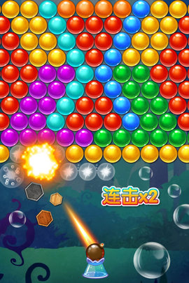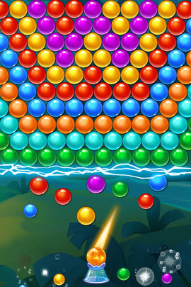 2、玩家操控屏幕下方的发射器来发射泡泡,通过滑动屏幕调整发射角度,当发射出去的泡泡与上方同颜色的泡泡相连接,且连接数量达到3个及以上时,这些同色泡泡就会消除。