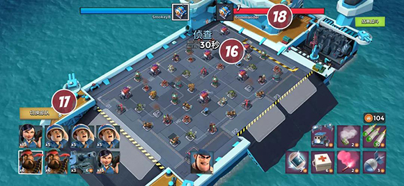 2、当屏幕上出现对手的战斗母舰后,⑯对战计时器就会开始倒计时。在这段时间内,您还可以点击⑰切换部队按钮,调整出战部队阵容。但请抓紧时间,倒计时很快就过去了哦!
