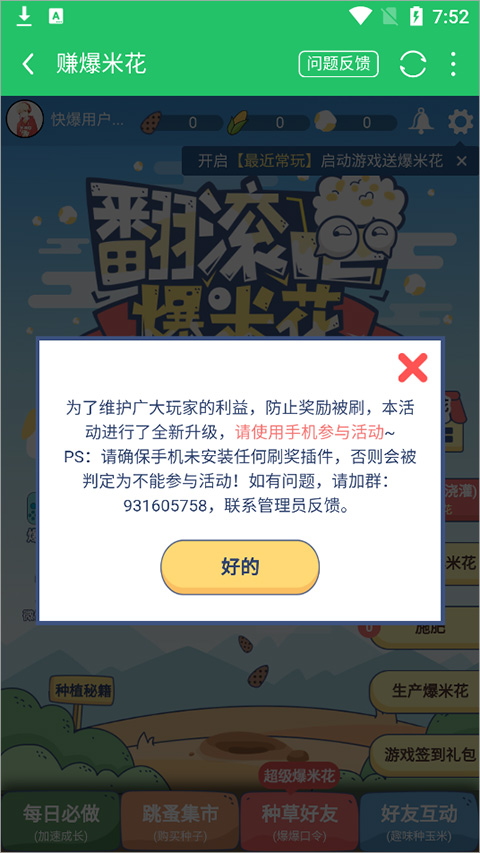 3、根据提示手机不能安装刷奖插件,否则不能参与活动