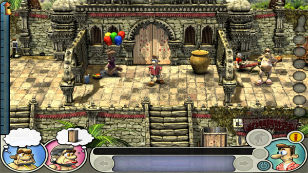 等老头离开右下,到右下,先放狗,就是拴着的那条,然后把试衣间旁的耙子放倒,到左下,在擦鞋机上使用割草机内胆,对大象使用老鼠,大象吓跑后对地上的粉笔线使用粉笔和粉笔擦,到左上,在募捐处放蛇,在电源(水龙头旁)使用电线,到右上,在跷跷板上使用铁锹,然后在喇叭里放气球内,躲到中上的篓子里看戏吧