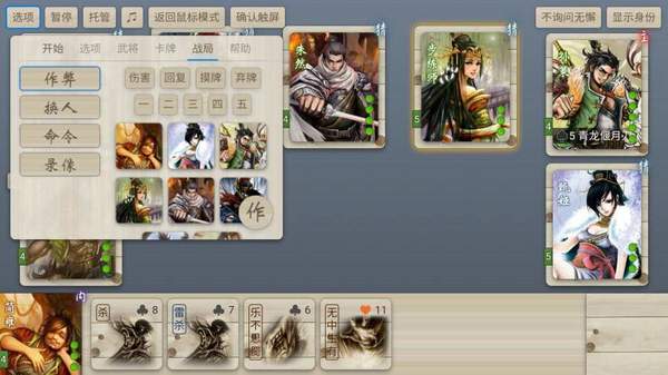 4、菜单显示在屏幕左上角,有开始,选项,武将,卡牌,扩展和其他这几大板块;