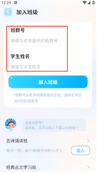 3、输入班群号和学生姓名之后点击【加入班级】即可。