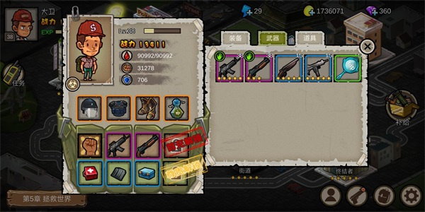 6、第五章第10关扫荡刷橙色装备碎片(终结者):5-10这一关(2.06版本剧情模式最终关卡)需要玩家学会利用距离吸引僵尸,必须分批次把僵尸慢慢引过来杀,不能一口气引几十个,那样很容易被秒,5-10这一关只要BOSS在玩家屏幕外,基本上就不追上玩家了,好好利用这一点才能过关。