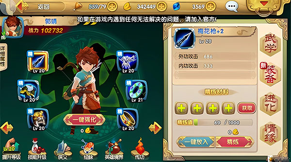 2、装备强化:消耗金币可以对穿戴中的装备进行强化。强化后装备属性提高。装备可强化的等级上限为穿戴英雄的等级。