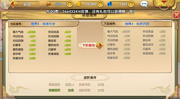 在英雄界面中,玩家会看到一个英雄境界的按钮,它不用消耗任何道具,有点像成就的功能,玩家完成它的条件即可进阶来增加属性,玩法如下: