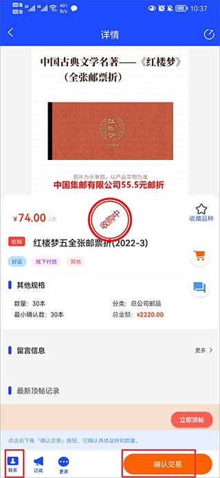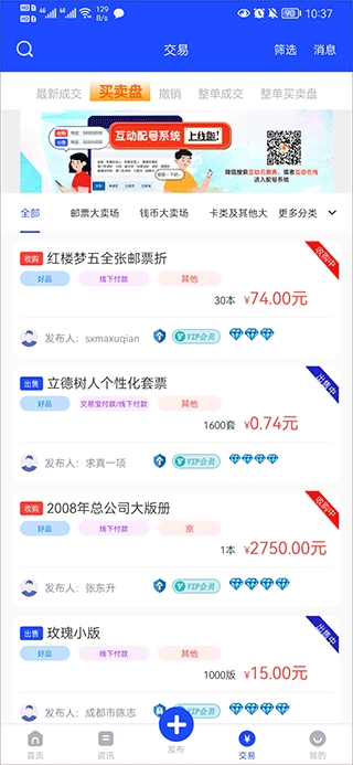 6、用户也可以直接在交易界面中选择其他用户发布的收购和出售进行交易