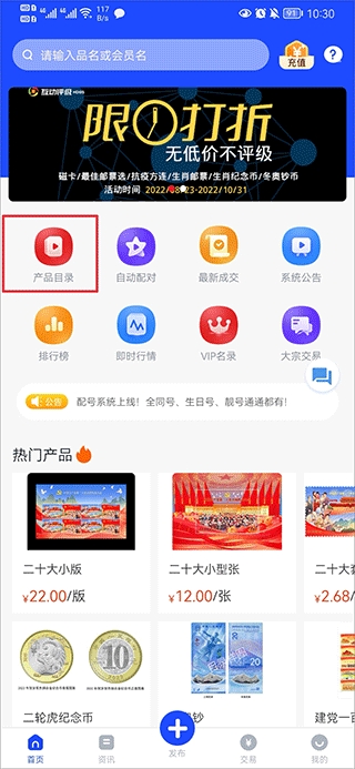 1、打开邮币卡互动网app,在首页中点击产品目录