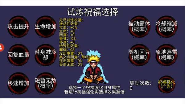1、在像素火影秽土柱间版游戏当中选择无尽试炼模式