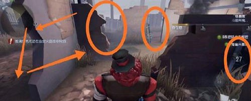 这是一个比较好绕的点,图中用圈出来的两个地方可以互相回绕,当屠夫快追上的时候可以把板子放下来,等屠夫踩上去就转到废墟。如果屠夫不踩木板,那就可以无限绕,记得把握好距离。