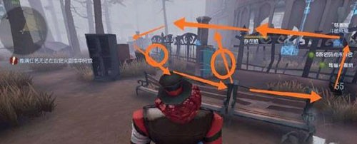 这个点位直接放板,然后围着左边的围墙绕,绕法就按照图中的箭头指示,如果屠夫踩板,直接转去无敌点,右边圈住的地方有一块木板,可以直接放倒。