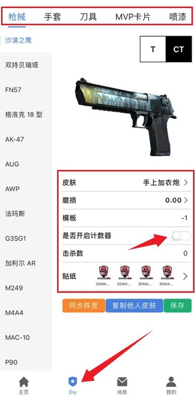 3、来到DIY界面,用户可以查看到各种装备和武器道具,可以设置击杀数,或者选择是否开启计数器灯功能。