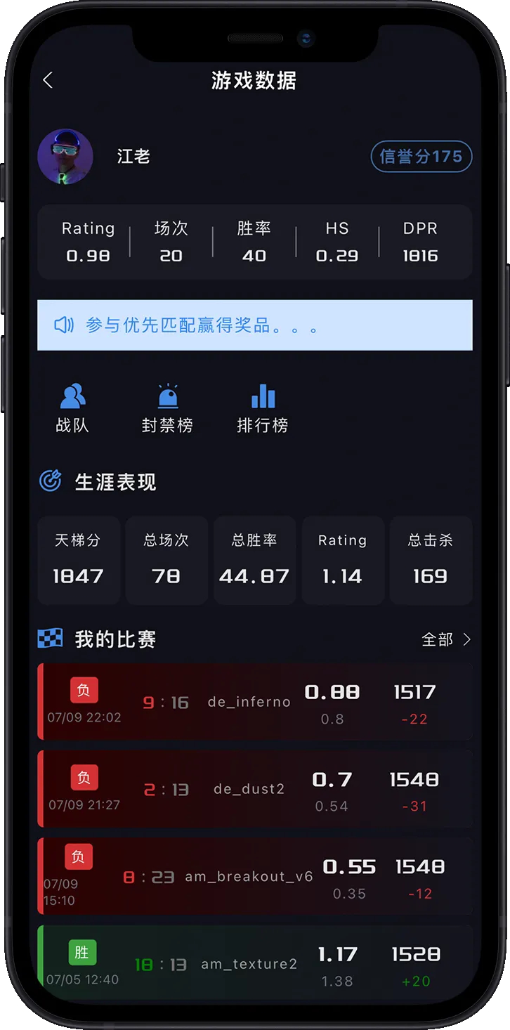 2、提供联赛分数、知名主播俱乐部排名、Elo评级以及击杀/死亡比率等排行榜查询服务。