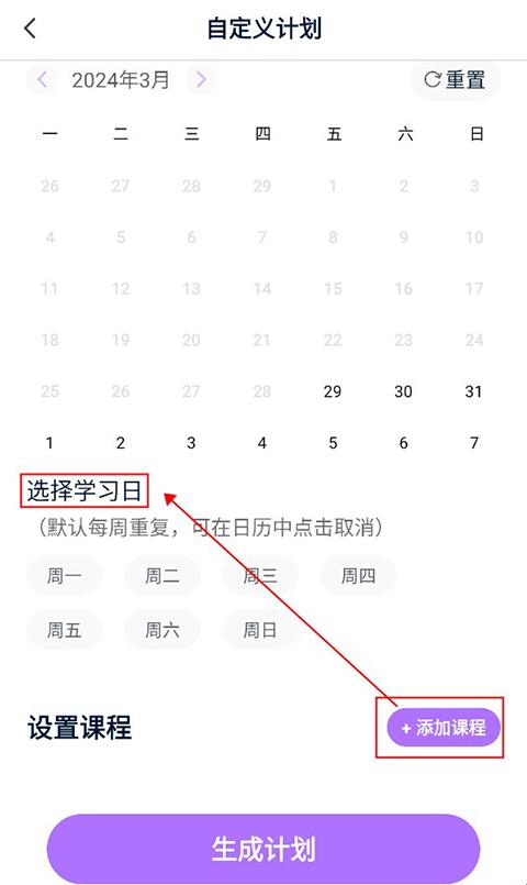 4、如果选择的是智能定制,按照课程直接就能生成,如果选择自定义用户需要选择好日期以及学习日,添加好课程点击生成即可。