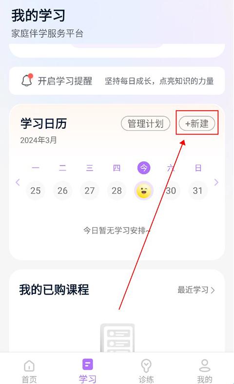 1、用户在购课后可以进行学习计划的制定,在学习页面点击新建。