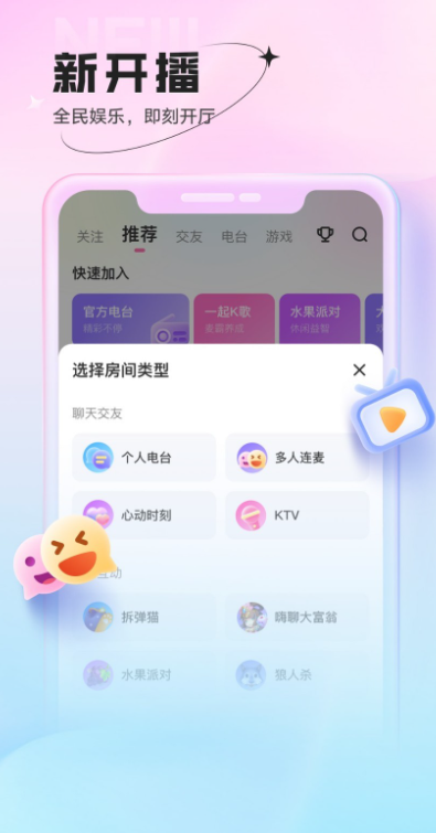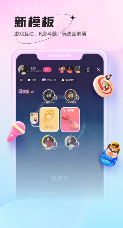3、抢麦唱歌、猜歌红包、团战PK…各种精彩等你来玩!炫酷直播、海量曲库应有尽有。