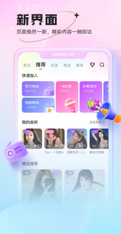 1、精准的大数据推荐功能,能够自动为你推荐最适合你的声音,你最喜欢类型的房间。