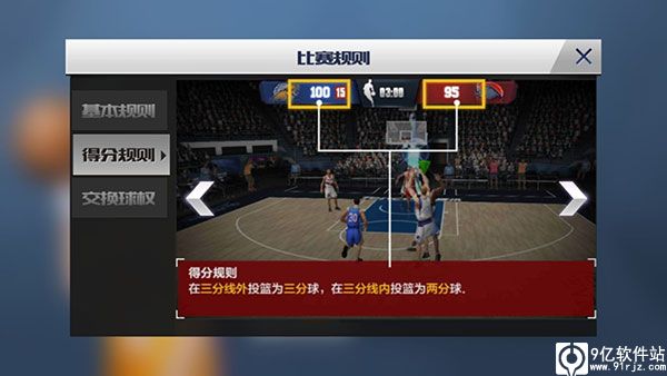 得分规则:三分线处投篮即为三分,三分线以内全部为两分,扣篮、上篮即为两分。比赛胜利与否根据比分决定。
