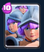 紫发美眉*3,理论上赚了3费,实际上比较笨重的一张卡牌。属性和同级火枪手完全一样,但是需要9费施放。目前比较流行的三个火枪手应用是圣水收集器积累费用,巨人前方吸收伤害,三个火枪手后排安全输出,后来优化为大皮卡前排进攻,火枪手在后,战斗力更加强大但是费用也更加笨重。三个火枪手相当于群体输出单位,同时对单体的伤害也非常高,对付各种目标都游刃有余,当然近身战斗还是比较薄弱。