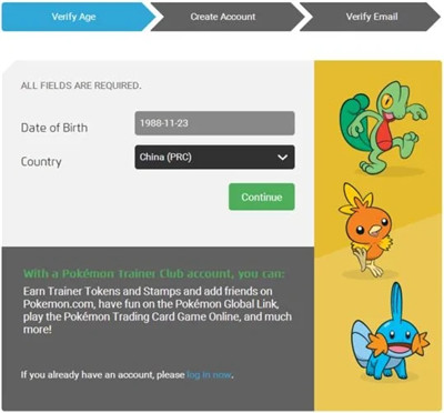3、在跳转页面填上生日和地区,点绿色“continue”;