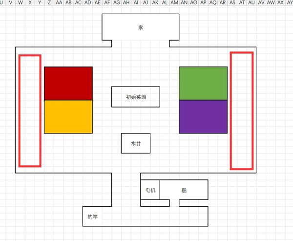 五个菜园只需要解锁两个,分别是红色和紫色,也就是最高级的和最高级的斜对角,目的有两个,一个是开路,方便夜里找小丑。有时候就是因为两步路的距离没有交互到小丑,就被蓝色小丑当面刀了。蓝色为大概找小丑的路线,对,就是走Z字形。