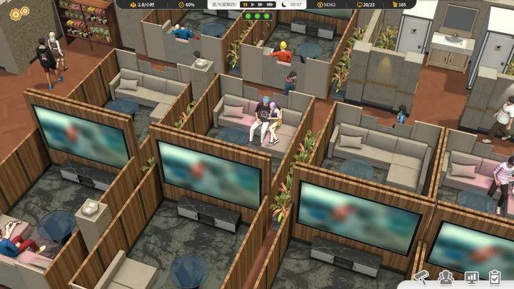 在你的网吧里建设各种区域,合理摆放各种装饰和桌椅电脑,让顾客们都满意。