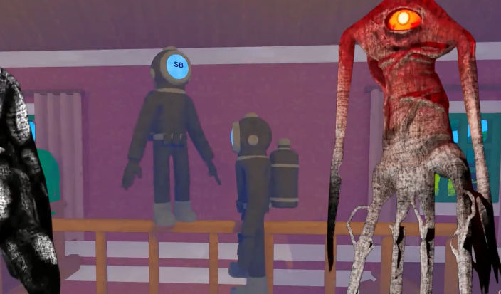 2、小队起来,用ASCII面孔定制器定制你的面孔,购买一些装备,使用潜水钟去旧世界!在那里,你会遇到可怕的物理动画怪物,诅咒的文物和其他文物!