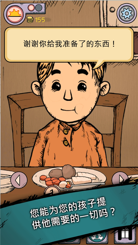 4、在游戏中搜集食物,工作赚钱,同时帮孩子做饭、缝补衣物,陪孩子一起玩。