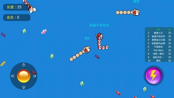 3、在游戏中,玩家需要吃彩色糖果来使自己变得更长更大。