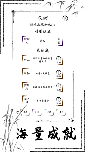 3,玩家可以在游戏中不断进行转世,转世能获得更好的初始属性,能实现更高的人生目标。