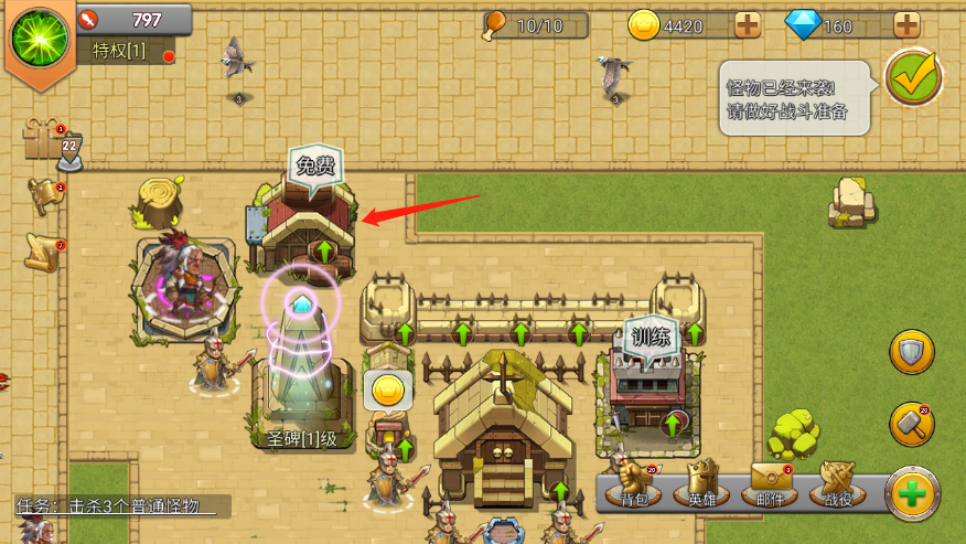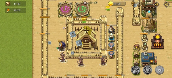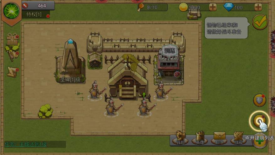 2、紧接着玩家需要建造一座防御塔,保护城市!如图所示,点击这里打开建筑列表,这里有许多类型的防御塔可以作为选择,有祭坛、箭塔,还有金矿、城墙等等,不过初期来说,先建造一些箭塔进行防御,点击【箭塔】;